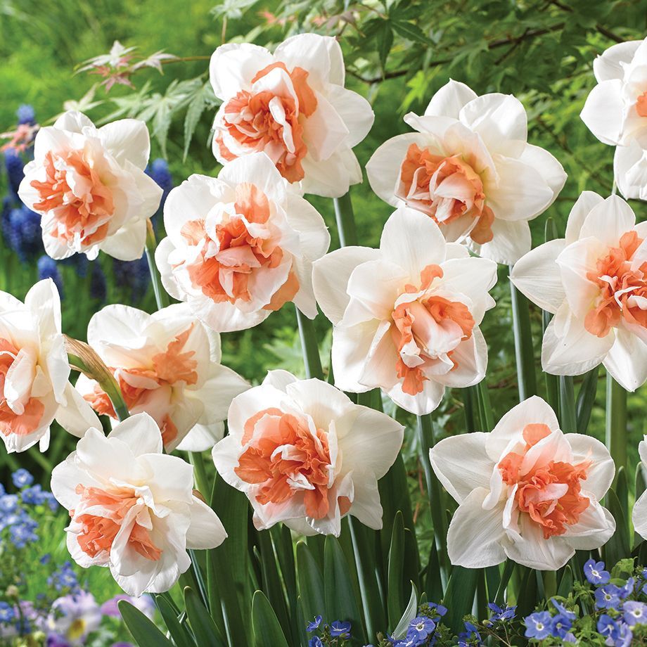 Нарцисс Май Стори - махровый, красивоцветущий, многолетний сорт. Цветки крупные, белого цвета с пышной бело-розовой короной. Луковицы нарциссов среднего размера, отлично приживаются при любых климатических условиях. Растение неприхотливое в выращивании, стебель прямостоячий, крепкий. Нарцисс Май Стори пользуется особой популярностью в декоративном садоводстве, их используют в озеленении, выращивают в открытом грунте на клумбах.