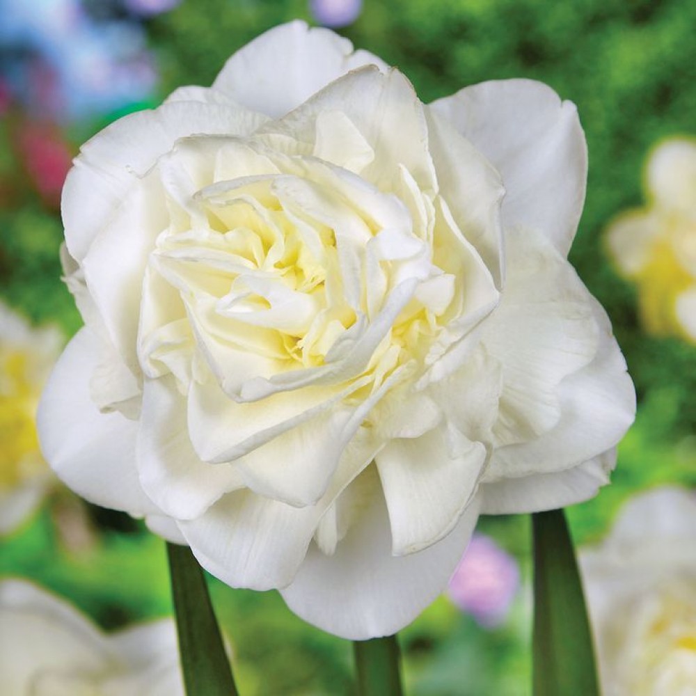 Нарцисс Обдэм - густомахровый сорт. Выделяется на фоне своих собратьев чудесными цветками нежного окраса. Цветки белоснежные с лёгким напылением светло-желтого у основания лепестком. Предпочитает влажную почву, при соблюдении хорошего дренажа, отлично развиваются на тяжелых и суглинистых почвах. Махровые нарциссы пользуются особой популярностью в декоративном садоводстве, их используют в озеленении, выращивают в открытом грунте на клумбах. Нарцисс Обдэм красиво смотрится в массовых посадках.