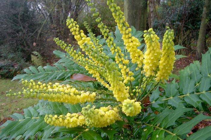 Магония Winter Sun - вечнозелёный вертикально растущий, слаборазветвлённый кустарник с толстыми скелетными ветвями. Высота 1,5-1,8 (до 2,5) м, при мягком климате выше. Листья расположены очерёдно, непарноперистые, состоят из 21 листочка, узко яйцевидные, длиной 10 см, острозубчатые, сверху зелёные, снизу светлее. Осенняя окраска старых листьев жёлто-оранжево-красная. Зацветает очень рано, в марте-апреле. Жёлтые ароматные цветки собраны в пучки и поникающие соцветия длиной 20-30 см. Основные корни глубокие. Плодородные, гумусные, свежие, рыхлые, равномерно увлажнённые почвы, от кислых до слабощелочных.