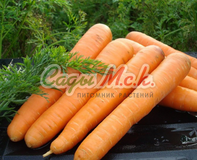 Среднеранний (100 дней от всходов до технической спелости) гибрид для использования в свежем виде, выращивания на пучковую продукцию и зимнего хранения. Розетка листьев полураскидистая. Корнеплод средней длины, ровный, цилиндрический с тупым кончиком (сортотип Нантская), оранжевого цвета, длиной 20-22 см, массой 100-230 г, с маленькой сердцевиной. Мякоть отличного вкуса, сочная. Урожайность 2,2-5,6 (до 7,3) кг/м2. Посев семян в грунт производится в конце апреля – начале мая на глубину 1 см, расстояние между рядками 18-20 см. Подросшие всходы прореживают, оставляя между растениями по 5-6 см.