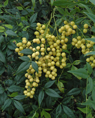 Нандина Alba - многолетний кустарник. Высота взрослого растения варьируется от 90 до 150 см. Листва летом насыщенно-зеленая. Осенью цвет варьируется от светло-зеленого до желтого. Отличительной чертой сорта являются кремово-белые ягоды, которые появляются осенью. Сорт отлично подходит для массовых посадок.