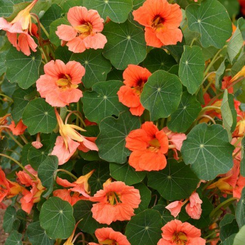 Настурция Salmon Baby - высотой 20-25 см, компактный. Цветки у него лососево-розовые, полумахровые, листья темно-зеленые.