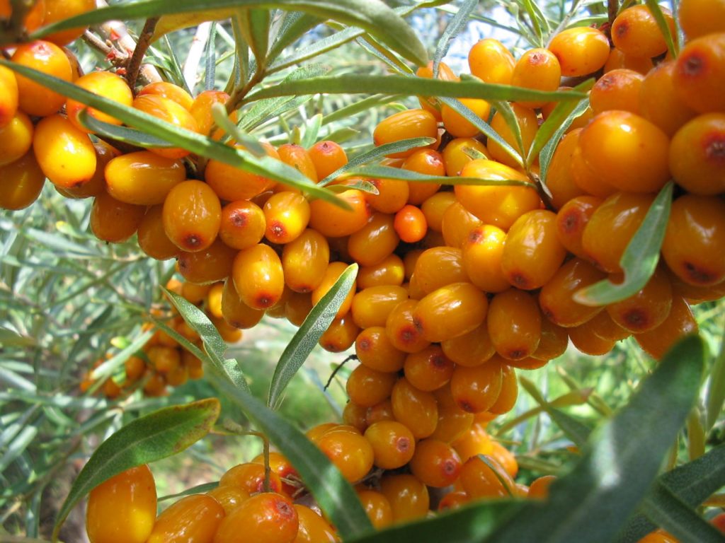 Саженцы облепихи Великан вырастают в среднерослый куст высотой 3 м с красивой овальной кроной. Основная ветвь отлично выделена, на побегах колючек не имеется. Крупномер Великан любит солнце и супесчаные почвы. Плоды крупные, цилиндрической формы, оранжевые созревают в сентябре. Длина плодоножки 5 мм. Плоды можно употреблять в свежем виде и для разных видов переработки.
