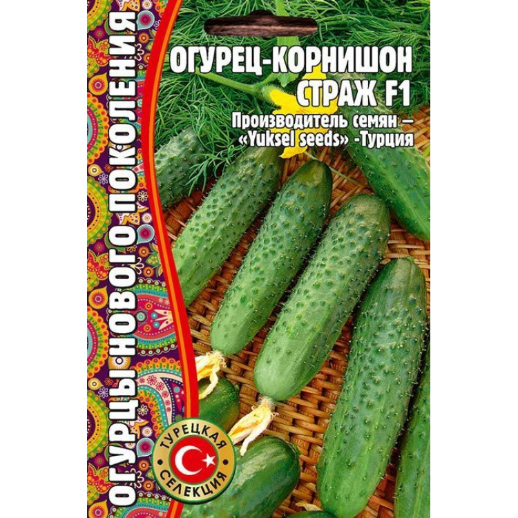 Страж – ранний (38-42 дня) самоопыляемый гибрид ярко выраженного букетного типа. В узле формируется по 4-6 завязей. Неограниченный потенциал урожайности. Рекомендуется для выращивания в весеннем и летне – осеннем обороте в пленочных теплицах, а также в открытом грунте. Растение мощное, с ограниченным боковым ветвлением, корневая система отлично адаптируется к любым видам почв. Зеленцы очень привлекательного вида: востребованного зеленого цвета, длиной до 12-14 см, диаметром 3,5-4,0 см, массой до 120-150 гр. Плоды транспортабельные, долго сохраняют товарный вид после сбора. Мякоть плотная, хрустящая, ароматная. Вкусовые качества превосходные, как в свежем так и в консервированном виде.