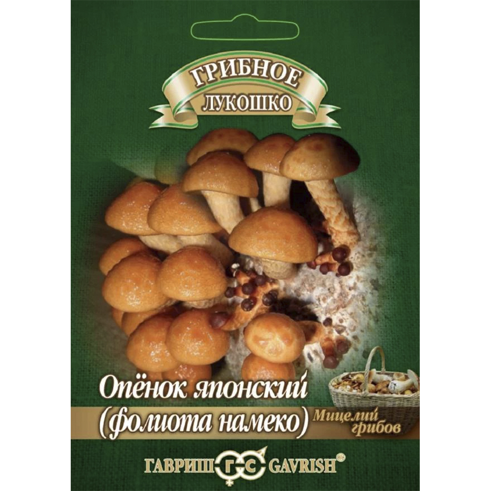 Один из самых популярных грибов японской кухни. Содержит целебные вещества подавляющие развитие стафилококка. Шляпка диаметром 3–8 см, оранжево-коричневая, полусферическая с плоской верхушкой. Внешняя сторона шляпки покрыта блестящей слизью органического происхождения—густой и обильной у молодых грибов, а у взрослых грибов водянистой и менее обильной. Ножка длиной 5 см, тонкая. Фолиота намеко удобен в приготовлении и является отличной составляющей меню настоящих гурманов. Маслянистая пленка в процессе приготовления исчезает и гриб приобретает хрусткость и приятный пряно-грибной вкус. Советы по разведению: Выращивают как на открытом воздухе, так и в закрытых помещениях при температуре от 10 до 27°С. Благоприятное время для высадки грибов на древесную основу в природных условиях — в апреле — мае или августе, в помещении — в течение всего года. В качестве древесной основы используют несвежее (1 месяц после рубки), влажное (влажность минимум 50-60 %) бревно лиственных пород (бук, граб, ольха, осина, клен, береза, тополь, ива, каштан, дуб) без признаков гнили, с корой и без веток, диаметром 20-50 см, длиной 30-50 см. Если древесина сухая ее замачивают в воде на 2-3 дня, избытку воды дают стечь. Пропитанную древесину помещают в теплое, проветриваемое помещение на несколько дней. Выращивание и уход: I этап - 1. В подготовленном бревне просверливают отверстия диаметром 0,8 см и длиной 4 см в шахматном порядке на расстоянии около 10 см друг от друга. 2. Вставляют грибные палочки в отверстия до упора (операцию проделывают в стерильных перчатках или продезинфецированными спиртом руками). 3. Оборачивают бревно полиэтиленовой пленкой, сделав небольшие отверстия для доступа воздуха. 4. Помещают бревно в темное влажное помещение и оставляют обрастать мицелием. При температуре 20 ?С бревно обрастает 3-4 месяца, при температуре 10 ?С – 5-6 месяцев. При температуре выше 34 ?С мицелий может погибнуть. Бревна заросли если на поверхности, в местах заражения, виден белый мицелий. II этап - 1. В затененном и защищенном от ветра месте в саду выкапывают лунку глубиной 10-15 см, дно лунки увлажняют. Можно выращивать на балконе, посадив древесину после оброста мицелием в кадку с землей. 2. Обросшее грибницей бревно закапывают горизонтально в землю на ? толщины. Обсыпают почву вокруг бревна древесной золой (для борьбы с улитками). Оптимальная температура для образования плодовых тел – от 10 до 15°С. 3. В сухую погоду почву вокруг бревна поливают каждую неделю из расчета 5л на 1м?. Поздней осенью бревно присыпают листьями и оставляют зимовать. 4. Со следующей весны закладку регулярно увлажняют по мере необходимости. Плодоношение: Первый урожай при выращивании на мягкой древесине (береза, тополь, ива, липа) через 5 месяцев, на твердой (бук, дуб, ясень, клен) – через 9 месяцев. Плодоношение волнами до 5 лет на мягкой древесине, до 8 лет на твердой. Урожайность: От 20 до 50% от веса бревна. Состав: Мицелий грибов "Опенок японский (Фолиота намеко)" на древесных палочках. Невскрытый пакет хранить в сухом прохладном месте, возможно в холодильнике при положительной температуре.