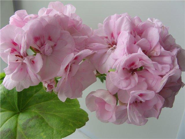 Пеларгония Milfield Gem - гибрид зональной и плющелистной пеларгонии. Листья мясистые, темно-зеленые со светлым жилкованием. Цветки махровые, кремово розовые с красными штрихами у основания некоторых лепестков. Соцветия очень крупные, плотные.