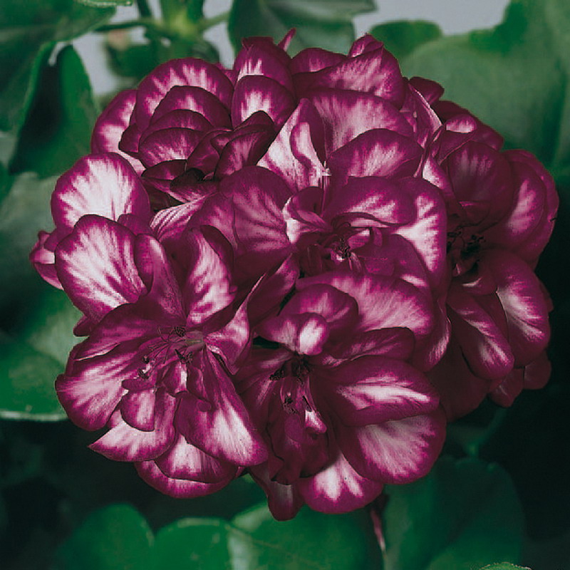 Пеларгония Mexica Tomcat - красивоцветущий пышный куст. Листья у растения мясистые, гладкие, глянцевые, блестящие, темно-зеленого окраса. Цветет сорт округлыми соцветиями крупных полу-махровых цветков. Окрас лепестков удивительный: белый цвет центра лепестка резко переходит темно-фиолетовый у основания и по краям.