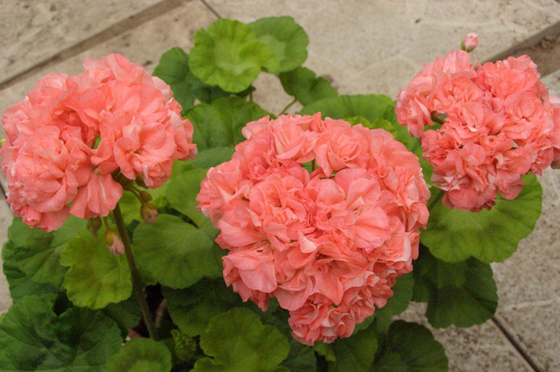 Пеларгония Vina - красивоцветущий кустарник. Относится к карликовым зональным пеларгониям. Цветет с весны по осень. Цветки густомахровые, светло-оранжевые с лососевым оттенком. Соцветия крупные и плотные. Листья салатовые, небольшие, темная зона слабо выраженная. Это растение предпочитает полутень.