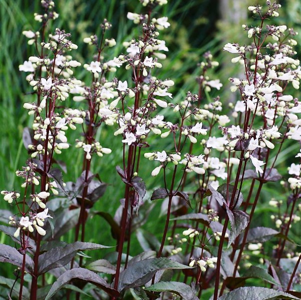 Пенстемон наперстянковый Мистика - растение достигает в высоту до 70 сантиметров и имеет темно-бордовые листья и стебли. Соцветия белые, кистевидные с приятным ароматом. Цветет культура с июня по конец августа.