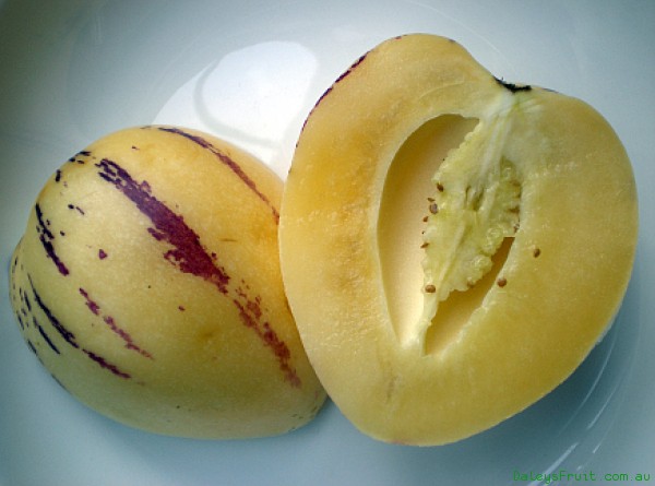 Пепино Kendall Gold - небольшой кустарник, достигает в высоту 1 метр. Плоды диаметром 10 см, куполоподобной, в разрезе сердцевидной формы. Кожура ярко-желтая с бордовыми полосами. Мякоть желтая. Созревшие плоды мягкие, ароматные