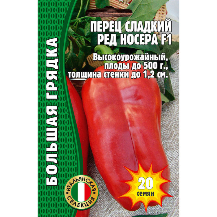 Ред Носера – непревзойдённый рекордсмен по размеру и толщине стенки, среднеранний сорт сладкого перца итальянской селекции. К сбору плодов приступают через 105 - 115 дней, считая с момента появления всходов. Растения перца Ред Носера среднерослые и имеют зонтиковидную форму, благодаря чему плоды защищены от солнечных ожогов. Плоды кубовидно-призматической формы отличаются очень крупными размерами: стандарт – 300 грамм; при надлежащей агротехнике - до 500 г.