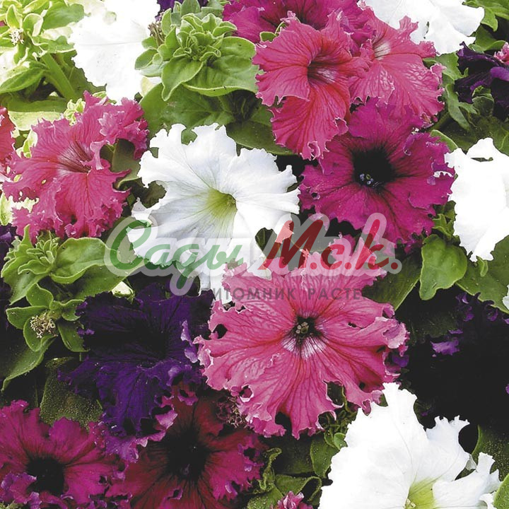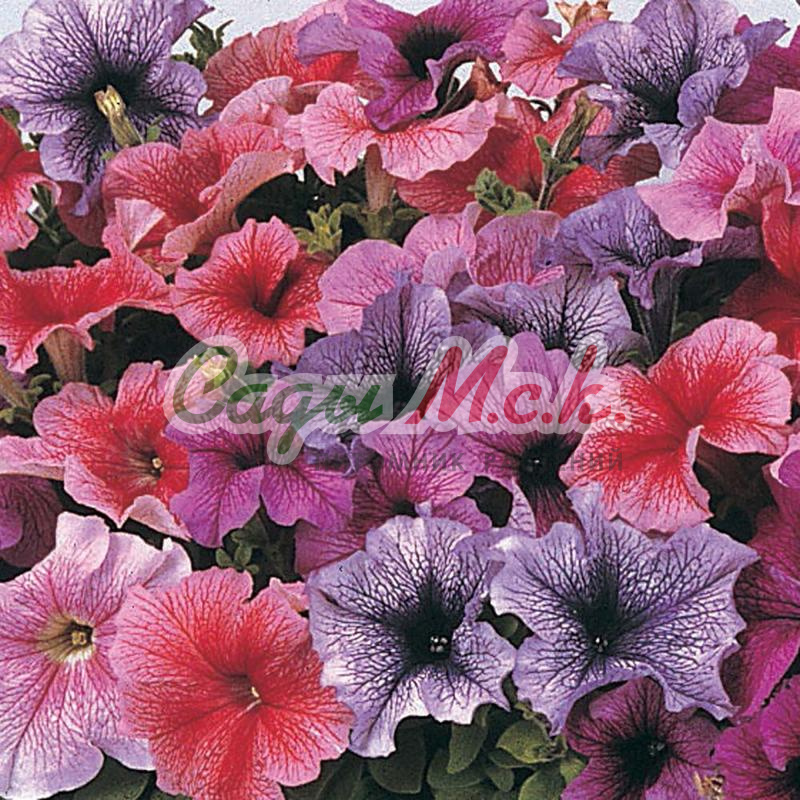 Необыкновенная смесь махровых крупноцветковых петуний. Соцветия лососевых, розовых, фиолетовых, белых и двуцветных окрасок в диаметре 12-14 см расположены на прямостоячем ветвистом стебле высотой 100-110 см. Цветет обильно с начала июня до заморозков. Выращивают рассадным способом. Семена высевают с января по апрель, поверхностно, не заделывая под стекло (после появления всходов стекло убирают). В зимние месяцы (январь-февраль) досветка обязательна. При ранних сроках посева цветение начинается в мае. Без дополнительного освещения петунию высевают не раньше марта. Всходы появляются через 7-12 дней. На постоянное место высаживают, когда минует опасность заморозков. Светолюбива и достаточно засухоустойчива. Предпочитает легкие, плодородные, хорошо дренированные почвы. Петунии можно выращивать в течение нескольких лет, сохраняя зимой в освещенном помещении (растение сильно обрезают, t не более 12°С, умеренный полив). Прекрасно смотрится в рабатках, миксбордерах, для срезки. При использовании для срезки главный стебель не прищипывают. Устойчива к неблагоприятным условиям.