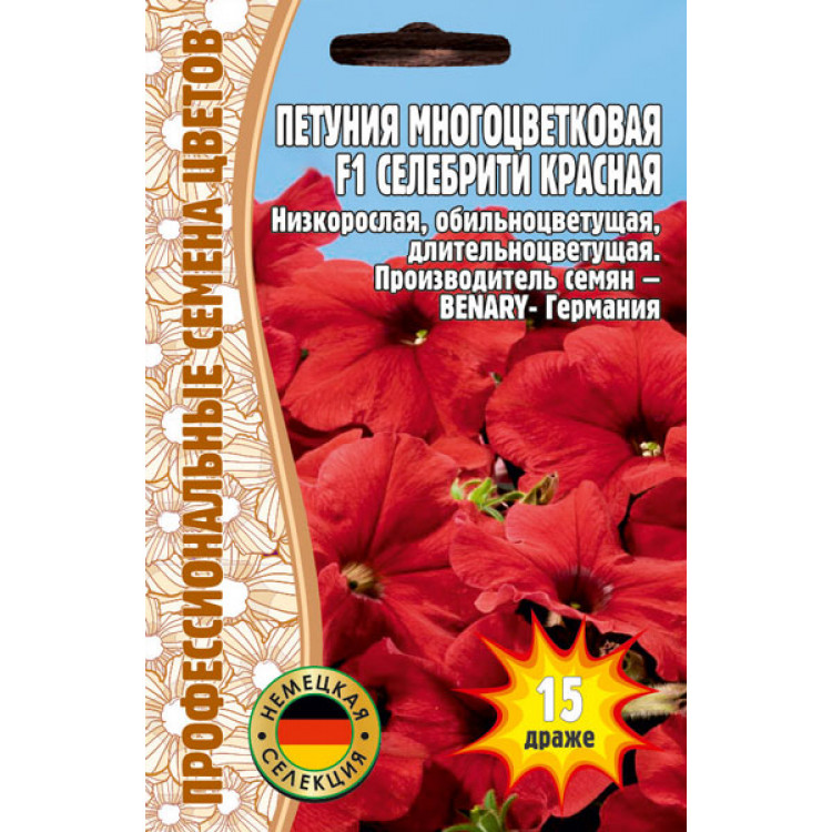 Прекрасный низкорослый обильноцветущий гибрид знаменитой немецкой фирмы BENARY. Высота взрослых растений 15-25 см. Многоцветковая длительноцветущая петуния Селебрити, характеризующаяся выровненным габитусом, обилием ярких крупных цветов, диаметром 7-8 см, и устойчивостью к неблагоприятным погодным условиям.