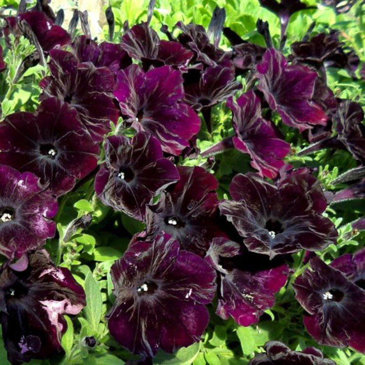Потрясающие бархатистые цветки практически черного цвета с бордовым отливом — настоящее событие в мире цветоводства! Растения образуют компактные кустики, которые обильно цветут, устойчивы к непогоде, восстанавливают форму и декоративность после дождя, весь сезон выглядят привлекательно и опрятно. Посев проводят с февраля по апрель, поверхностно, под стекло (после появления всходов стекло убирают). В зимние месяцы подстветка обязательна. Всходы появляются через 7-12 дней. На постоянное место высаживают, когда минует опасность заморозков. Светолюбива и достаточно засухоустойчива. Предпочитает легкие, плодородные, хорошо дренированные почвы. Петуния используется как фоновое и балконное растение, в контейнерах, вазах, для украшения подоконников, для посадки в рабатки, бордюры. Цветет обильно с начала мая до заморозков.