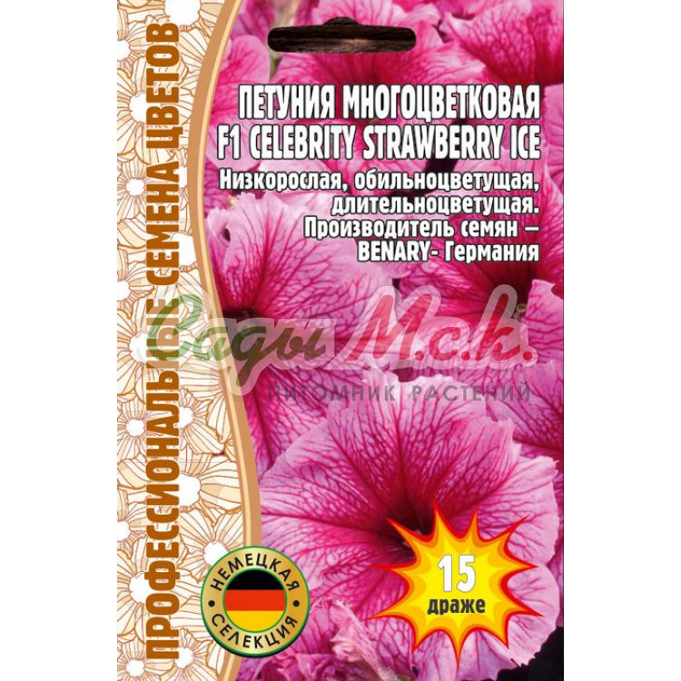 Образует сильно ветвящийся куст высотой 40 см. Выращивают рассадным способом. Посев проводят с января по апрель, поверхностно, под стекло (после появления всходов стекло убирают). В зимние месяцы январь-февраль досветка обязательна. При ранних сроках посева цветение начинается в мае, что очень удобно для выращивания растений на балконе, закрытых террасах, патио. Без дополнительного освещения петунию высевают не раньше марта. Всходы появляются через 7-12 дней. На постоянное место высаживают, когда минует опасность заморозков. Цветет с июня по сентябрь. Цветки до 7 см в диаметре. Светолюбива и достаточно засухоустойчива. Предпочитает легкие, плодородные, хорошо дренированные почвы. Петунии можно выращивать в течение нескольких лет, сохраняя зимой в освещенном помещении (растение сильно обрезают, t не более 12°C, умеренный полив). Петуния используется как фоновое и балконное растение, в контейнерах, вазах, для украшения подоконников, для посадки в рабатки, бордюры. Цветет обильно с начала мая до заморозков. Устойчива к неблагоприятным условиям.