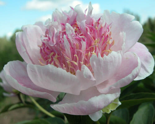 Травянистый пион Do Tell - сорт пиона с крупными соцветиями японского типа, отличающихся тонким ароматом. Соцветия этого сорта демонстрируют эффектное сочетание бледно-розовых внешних лепестков и перистых стаминодий. Длинные стаминодии окрашены в разные цвета: от бледно-розового до практически красного. В глаза также бросается утонченная орхидейная форма внешних лепестков. Куст прекрасной формы, высотой 80 см. Диаметр цветка 15 см. Стебли тонкие, но сильные, с боковыми бутонами. Листья тёмно-зелёные. Этот пион относится к сортам со средним сроком цветения.