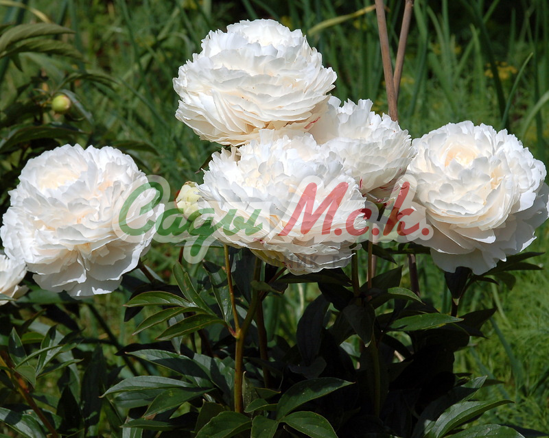 Травянистый пион Madame de Vernevill пестрое чудо в вашем саду. Соцветия окрашены в белый цвет с карминовыми мазками на центральных лепестках. Центр бутона имеет легкий бледно-розовый оттенок. Приятный аромат. Куст компактный и прочный, с множеством листьев. Стебли прямые и крепкие. Цветет этот пион в июне достаточно обильно и продолжительно в течение 8-10 дней. Высота 80 см. Размер цветка 13 см. Средний срок цветения.
