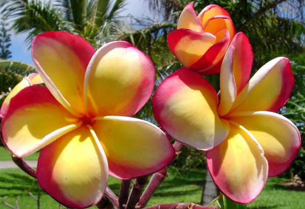Plumeria Intense Rainbow - цветущее растение, достигает 3,5 м в высоту. Цветки крупные, диаметром 7-10 см, простые, ароматные. Лепестки желтые с белыми и розовыми полосами по краям. Форма лепестков округлая, слегка продолговатая.