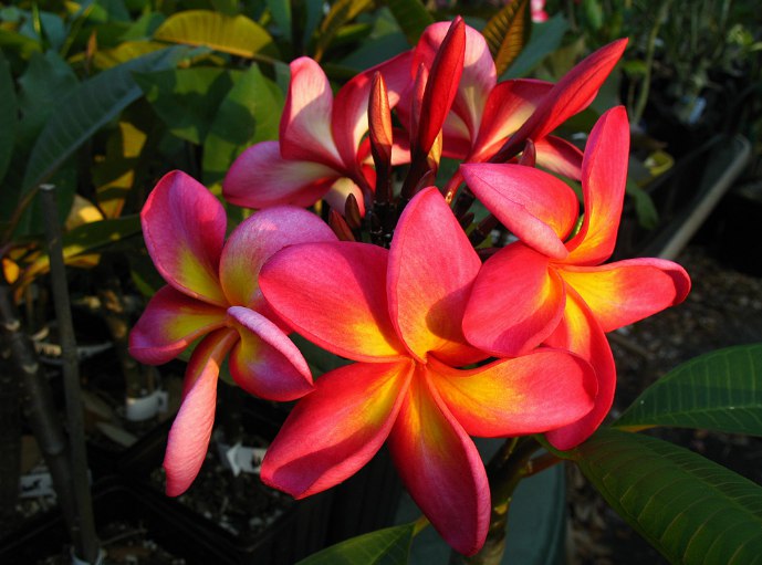 Plumeria Kalina - австралийский сорт. Цветки крупные, диаметром 8-11 см, яркие, отличной текстуры, сильно ароматизированные. Лепестки продолговатые, красно-розового цвета, у основания - желтые