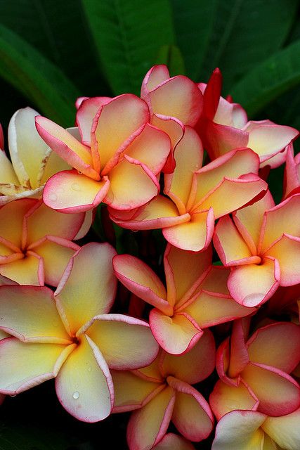 Plumeria Paung Yok цветет обильно. Цветки находятся в огромных соцветиях, состоят обычно из 5 лепестков. Лепестки продолговатые, белые, с желтым оттенком у центра и насыщенно-розовыми завернутыми краями.