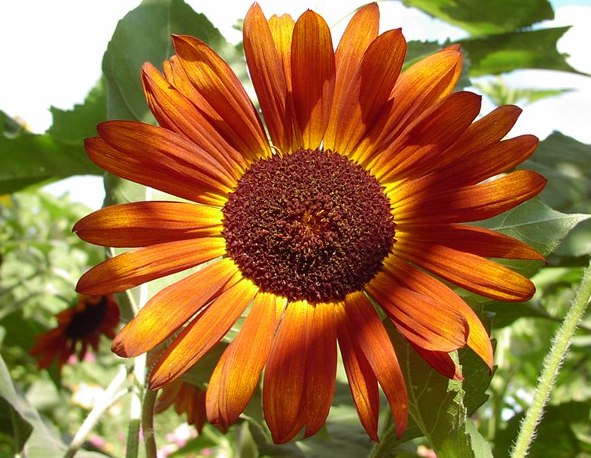 Подсолнечник декоративный (гелиантус) Velvet Queen - растение мощное. Высота стебля - 150-200 см. Цветок немахровый, диаметром 15 см. Лепестки овальные, коротко заостренные, бархатистые, огненно-багряные с желто-оранжевым оттенком. Дисковые цветки коричневато-пурпурные. Диаметр центрального диска - 5 см.