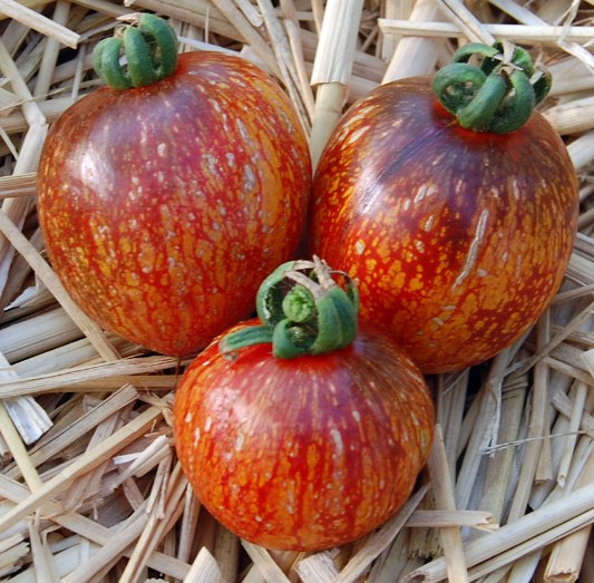 Помидор Dark Galaxy - один из самых уникальных сортов. Высота растения - 1,8 м. Плоды округлые, иногда слегка овальные, сначала зеленые с фиолетовым пятнами и полосами, при полном созревании кирпично-красные снизу, черные сверху, с черными и серыми пятнами по всей поверхности. Вкус насыщенно-сладкий. Масса плода - 100-200 грамм.