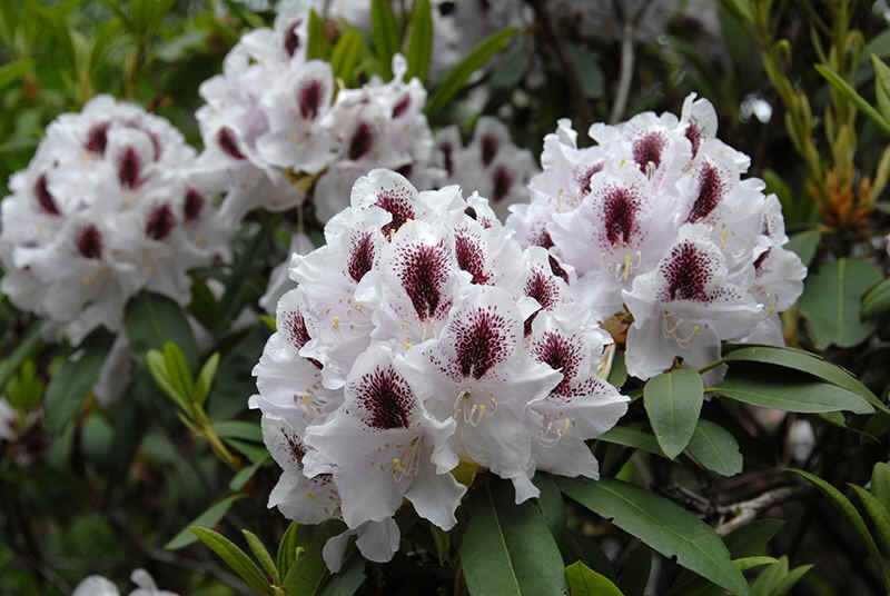Рододендрон Calsap - сильнорослый сорт с широким прямым силуэтом. Достигает 130 см в высоту и ширину. Белые цветы с лиловым оттенком украшает большое фиолетово-рубиновое пятно. Цветёт после 20 мая. Морозоустойчив.