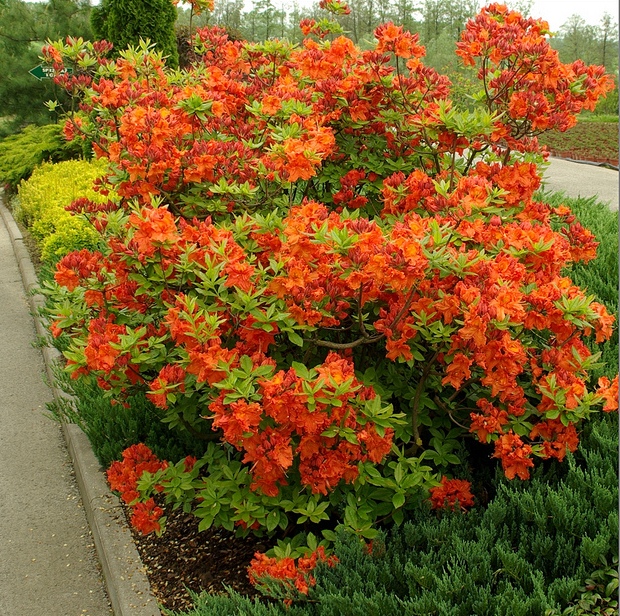 Рододендрон Gibraltar - густорастущий кустарник, к 10-ти годам достигает метра в высоту и 1,5 м в ширину. Листья блестящие, тёмно-зелёные. Цветёт очень буйно, цветы от оранжевых до красно-оранжевых, с загнутыми лепестками, которые раскрываются во 2-3-й декаде мая.