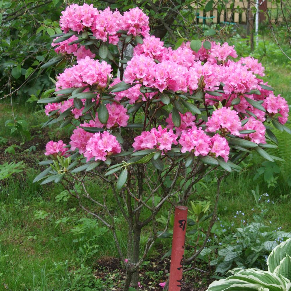 Рододендрон Гаага на штамбе – декоративный и вечнозеленый кустарник. Очень хорошо подходит для ландшафтного дизайна, в украшении парков и сада. Высота кустарника 150 см, в ширину разрастается до 130 -150 см. Листья темно-зеленого цвета. Цветение начинается с середины июня и длится около 3-х недель. В южных регионах цветение может начаться раньше. Цветки розового цвета, диаметр одного цветка 4-5 см. Цветы собраны в соцветия по 10-15 штук, из-за этого кустарник во время цветения смотрится прекрасно. Сажать саженцы рододендрона надо на солнечной стороне или в полутени. Рододендрон гибридный Гаага на штамбе предпочитает плодородную почву с небольшим закислением. Также требуется своевременный полив, подкормка удобрениями и обработка от болезней и вредителей. Морозостойкость у этого сорта высокая, может расти в северных регионах, но впервые 2-3 года, саженец надо будет на зиму хорошо укрыть.