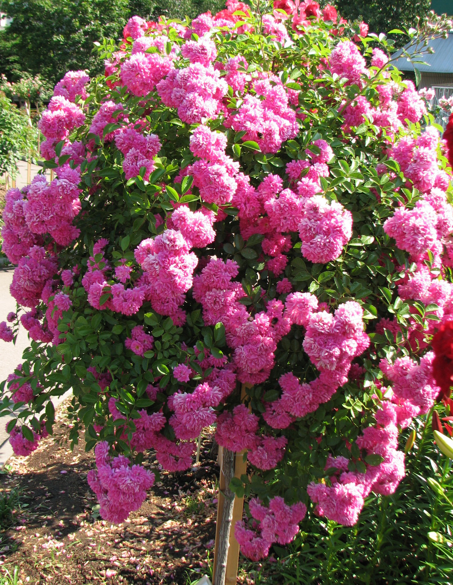 Роза Dorothy Perkins - очень обильноцветущая роза. Каскады цветков свисают с сильнорослого растения. Цветки махровые, розетковидные, мелкие, розовые. Листва блестящая, темно-зеленая. Выносит бедные почвы. Махровые малиновые цветки 6 см в диаметре собраны в пышные, красиво поникающие кисти, которые появляются в начале лета.
