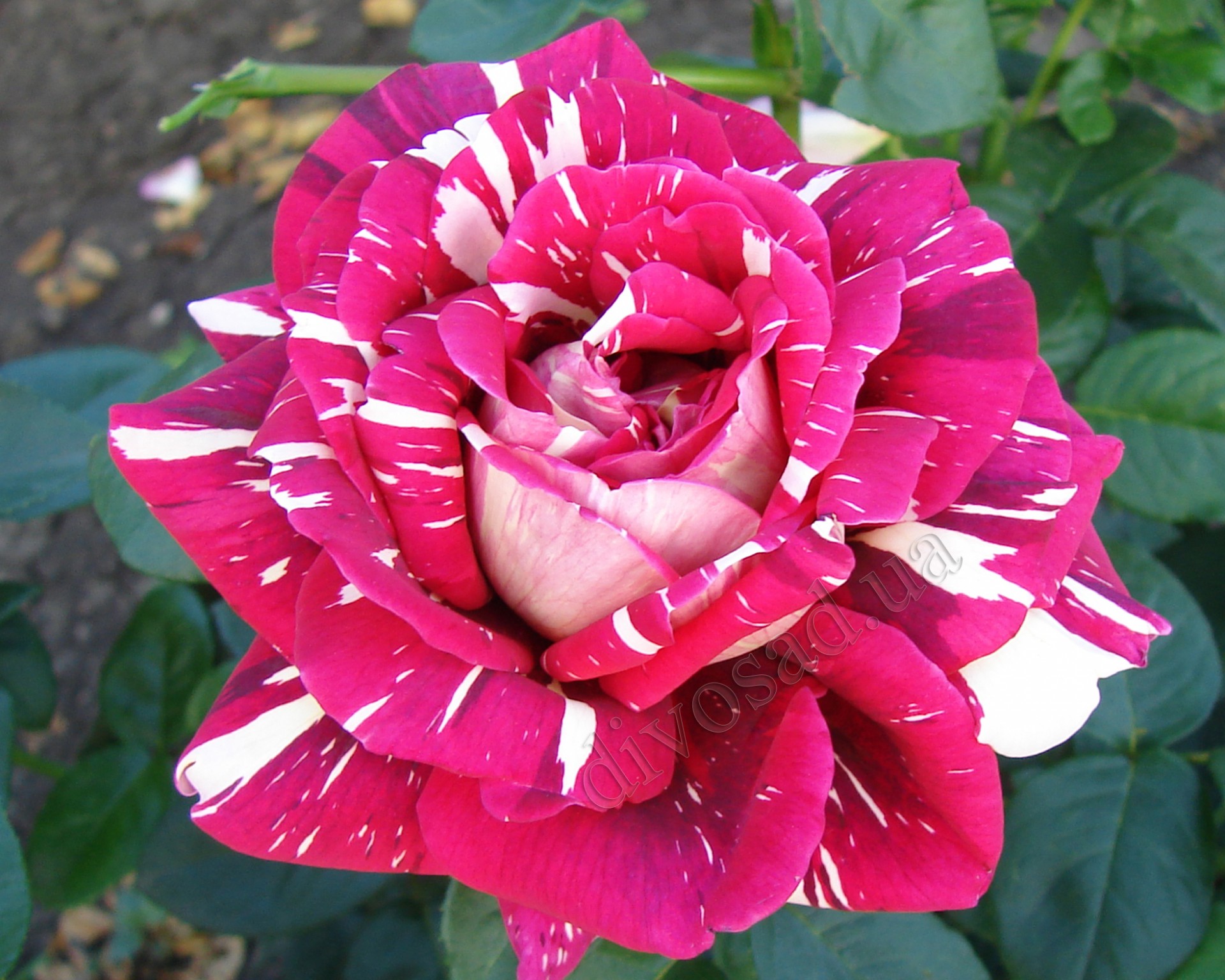 Роза Pestraja Fantazija - изящная роза с необычной окраской цветка. Цветки пёстрые, малиново-красного цвета с густыми белыми брызгами. Цветок чашевидный, крупный (12 - 14 см), махровый (до 70 лепестков). Сорт обладает приятным ароматом. Кусты компактные, высотой до 1 м. Листья тёмно-зелёные, блестящие, крупные, устойчивые к заболевания. Зимостойкость высокая.