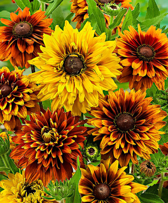 Потрясающие махровые цветки! Лепестки из смеси золотистожелтых, оранжевых, бронзовых и краснобордовых оттенков, напоминающие по цветовому охвату индийский закат. На высоких хорошо разветвленных стеблях с середины лета до начала осени каждый день распускаются новые фантастические цветки. Неприхотливые растения одинаково хорошо растут на клумбах, в смешанных композициях дикого сада, в границах и кашпо.