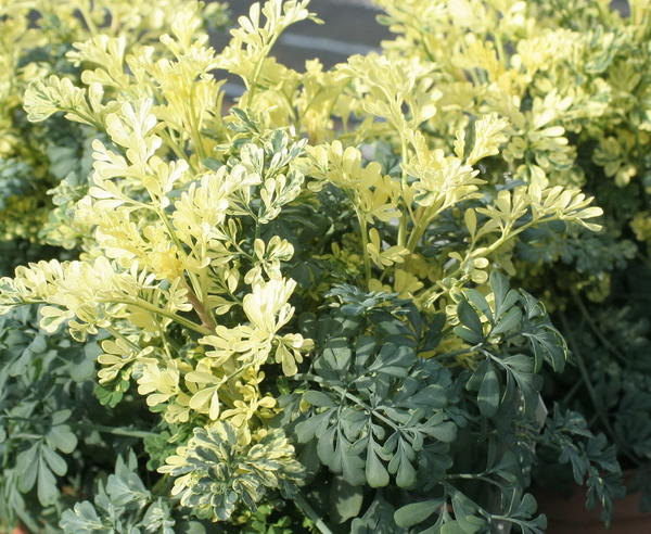 Рута душистая Variegata - сорт руты душистой. Вечнозеленый кустарник или полукустарник 30-50 см высоты. Листья ажурные, дважды и трижды перистые, в очертании треугольно-яйцевидные, на длинных черешках, пестроокрашенные, зеленые с кремово-белой каймой по краю