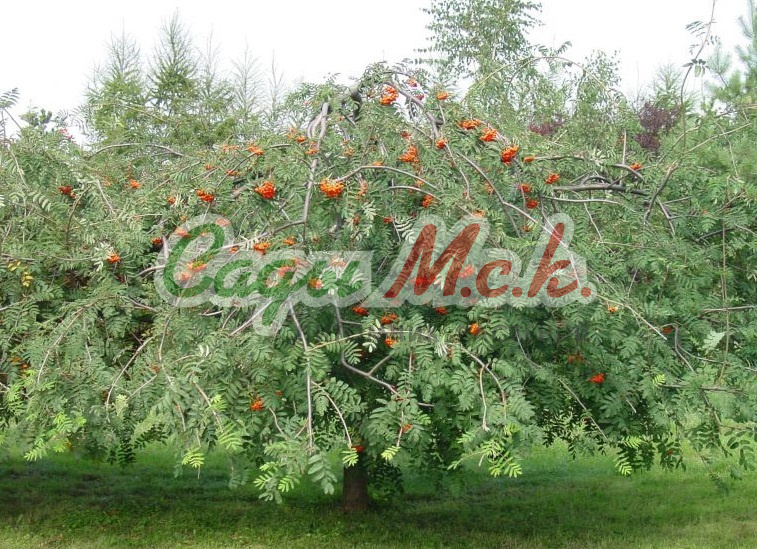 Рябина обыкновенная Пендула Вариегата - это небольшое дерево или крупный кустарник очень редкая форма с поникающими ветвями и золотистопёстрыми листьями. Цветки белые до 1 см, в крупных щитках. Плоды оранжево-красные, шаровидные, долго сохраняются на ветвях, очень украшая дерево ореха. Морозостойка, малотребовательна к почве.