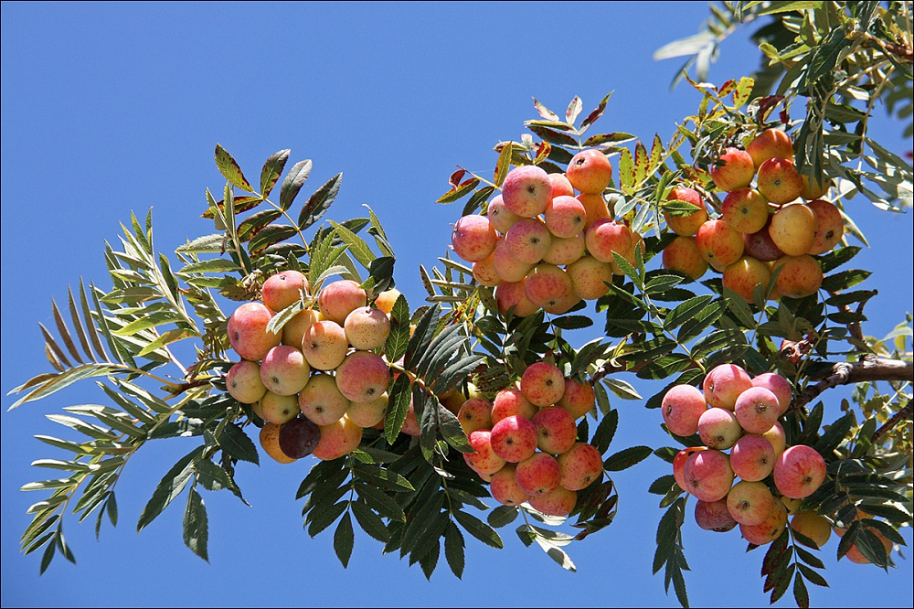 Рябина Моравская - сорт высокоурожайный, сильнорослый. Листья непарноперистые, тонкие, узко-ланцевидной формы. Плоды крупные, кисло-сладкие, ярко-красные. Плоды располагаются на сложных, очень крупных щитках, крупнее, чем у Невежинской рябины и остальных сортов.