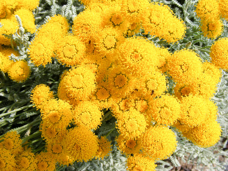 Идеальное растение для применения в качестве орнамента или окантовки при создании геометрических садов и не только. Сантолина образует компактные округлые кустики 25-40см высотой и ценится за необычайно красивую серо-серебристую листву и золотые шаровидные соцветия. Лист перистый, вечнозелёный, ароматный. Также отлично будет смотреться в солнечных цветниках, на склонах, щебёночных клумбах. Выигрышно сочетается с лавандой, котовником, сальвией и др.
