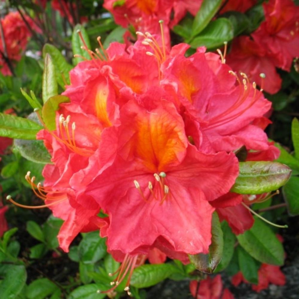 Рододендрон листопадный или азалия гибридная Juanita - куст с плотной овальной кроной. К 15-ти годам достигает 140 см в высоту и 160 см в диаметре. Цветёт очень обильно, в мае и июне. Цветки тёмно-розовые, с золотисто-желтым пятном и волнистым краем на лепестках. Морозостоек.