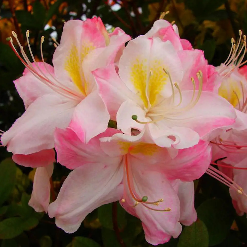 Азалия, Рододендрон желтый Сильфидес - сорт листопадных рододендронов гибридного происхождения. В возрасте 10 лет высота около 1,5-2,0 м Крона округлая. Листья блестящие, молодые красно-коричневые, позже зелёные. Соцветия несут 8—14 цветков. Цветки воронкообразные, бело-пурпурно-розовые с ярким жёлтым пятном. Цветки с ароматом средней интенсивности. Цветение в мае—июне.