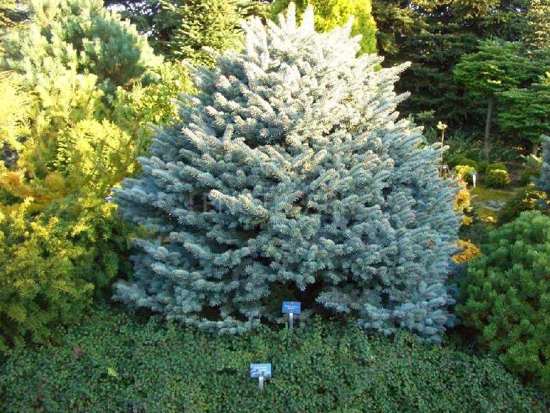 Ель колючая Thuem - популярный медленно растущий сорт ели колючей с очень плотной, нерегулярной, конической, широкопирамидальной кроной, достигающий высоты 2 – 3 метра и ширины 0,8 – 1 метр. Ветви короткие, приподнятые. Хвоя жесткая, остроконечная, серебристо-голубая. Окраска хвои сохраняется круглый год.