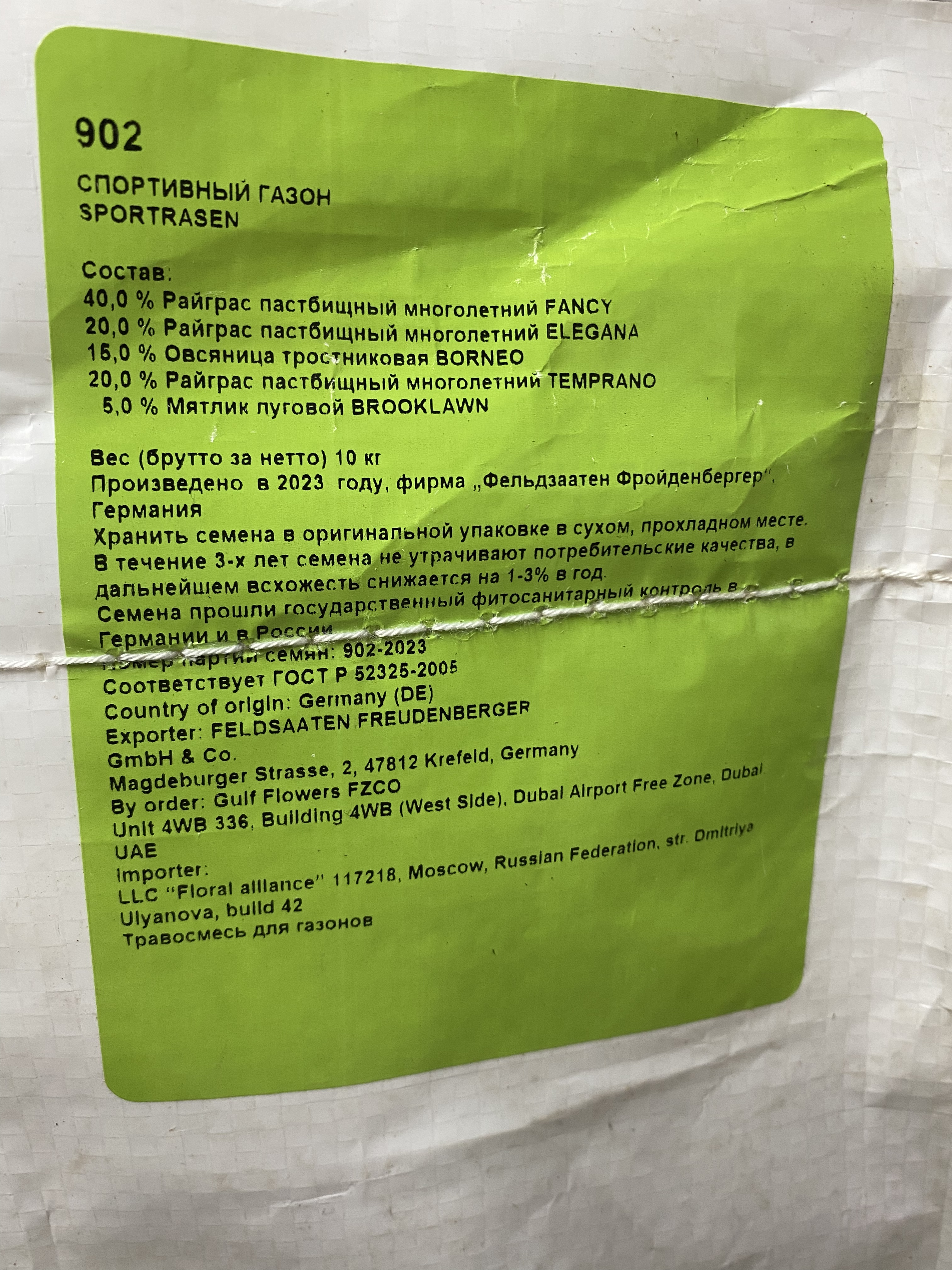 Состав: 40% Райграс пастбищный многолетний FANCY, 20% Райграс пастбищный многолетний ELEGANA, 15% Овсяница тростниковая BORNEO, 20% Райграс пастбищный многолетний TEMRANG, 5% Мятлик луговой BROOKLAWN. Производитель: Фельдзаатен Фройденбергер (FELDSAATEN FREUDENBERGER). Страна: Германия. Дата производства: 2023 г.