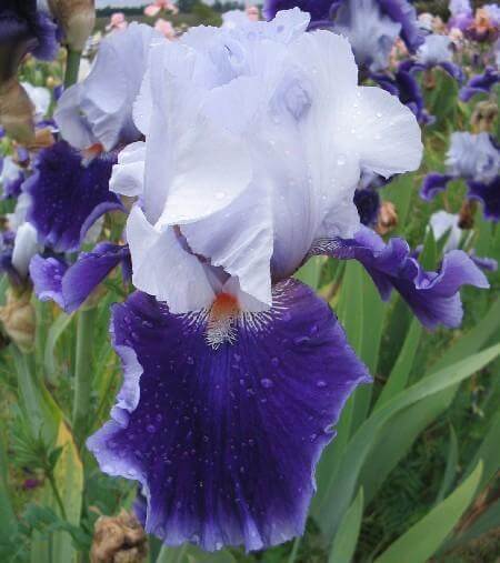 Ирис Belle de Nuit отличается светлыми стандартами с насыщенно сине-фиолетовыми фолами и намеком на светлые края и контрастной мандариновой бородкой с белым концом. Высота цветоноса 85 см. Срок цветения средний.