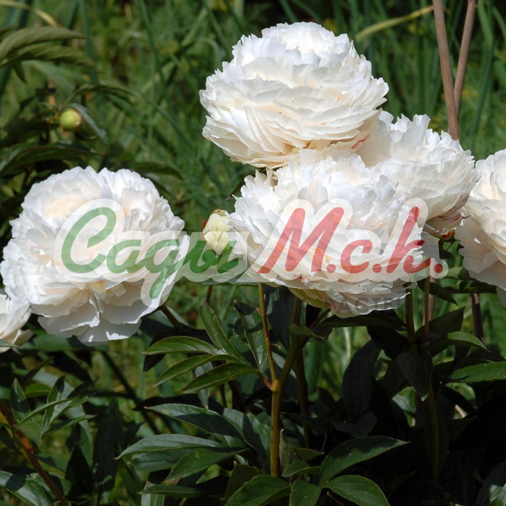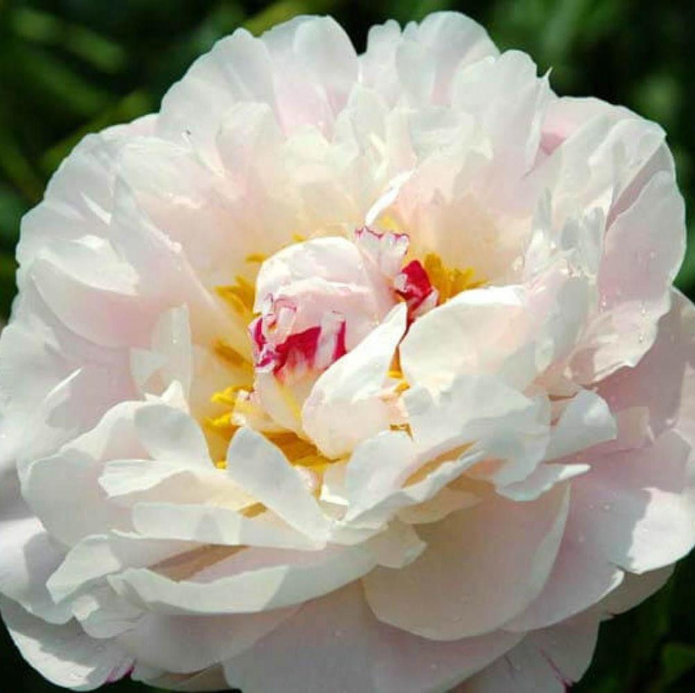 Травянистый пион Avalanzh махровый бомбовидный. Цветок диаметром 15-16 см, компактный, розовеюще-белый с чуть розовым центром и узким малиновым краем на некоторых лепестках. Аромат сильный приятный, но не сладкий. Высота 90 см. Срок цветения средне-поздний.