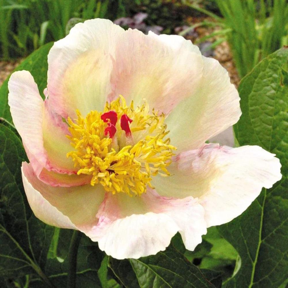 Семена пиона Le Printemps – отличный вариант для ценителей садового дизайна. На раскидистом кусте, высотой 60 см, со слабоветвистыми стеблями расцветают крупные немахровые бутоны молочного цвета с золотистыми тычинками, 16 см в диаметре. Необыкновенная окраска привлекает внимание весь сезон, радуя тонким ароматом цветов.