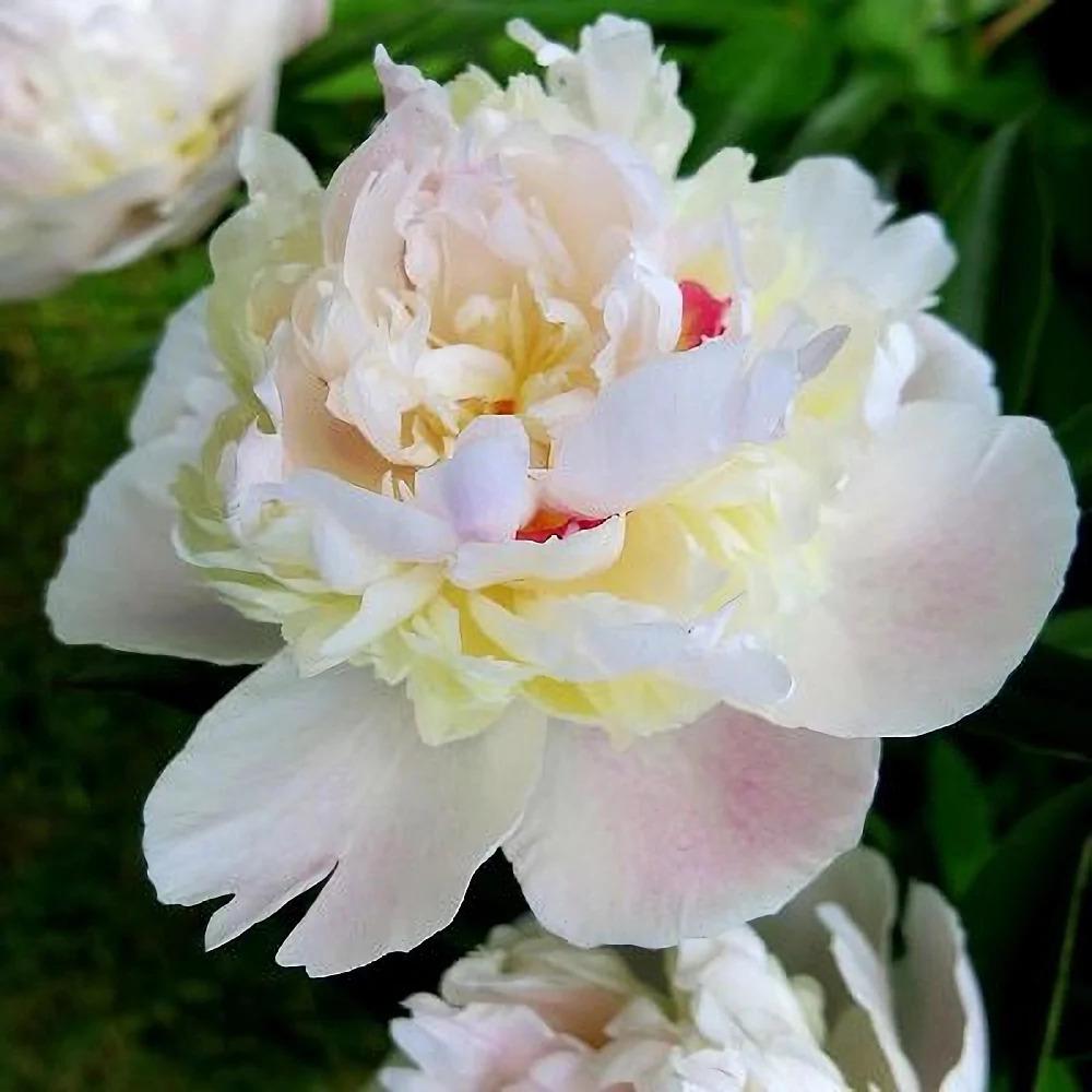 Травянистый пион Madame de Vernevill пестрое чудо в вашем саду. Соцветия окрашены в белый цвет с карминовыми мазками на центральных лепестках. Центр бутона имеет легкий бледно-розовый оттенок. Приятный аромат. Куст компактный и прочный, с множеством листьев. Стебли прямые и крепкие. Цветет этот пион в июне достаточно обильно и продолжительно в течение 8-10 дней. Высота 80 см. Размер цветка 13 см. Средний срок цветения.