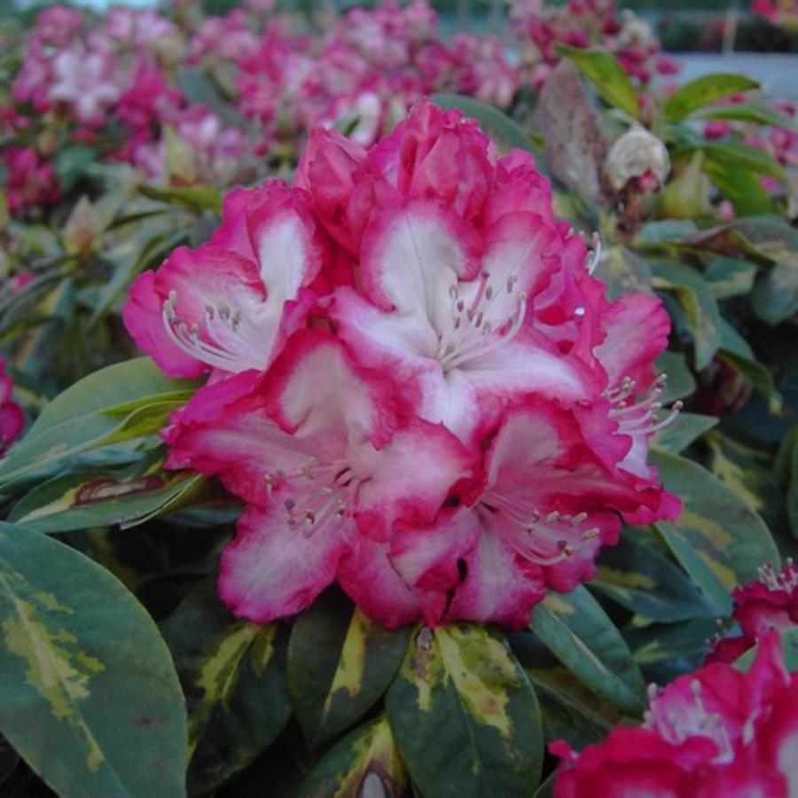 Рододендрон Президент Рузвельт - декоративный, вечнозеленый, мелколистный, мелкоцветковый, густой кустарник. Куст прямостоячий, низкорослый1,2 м, густой, широко распростертый, формируется легко, крона подушкообразная. Побеги покрыты черными чешуйками, короткие. Лист мелкий, широкоэллиптический, чешуйчатый со всех сторон. Цветок 5-7 см, белый, бело-розовый. с красной каймой, повторноцветущий сорт. Цветение продолжительное , обильное, ежегодное.