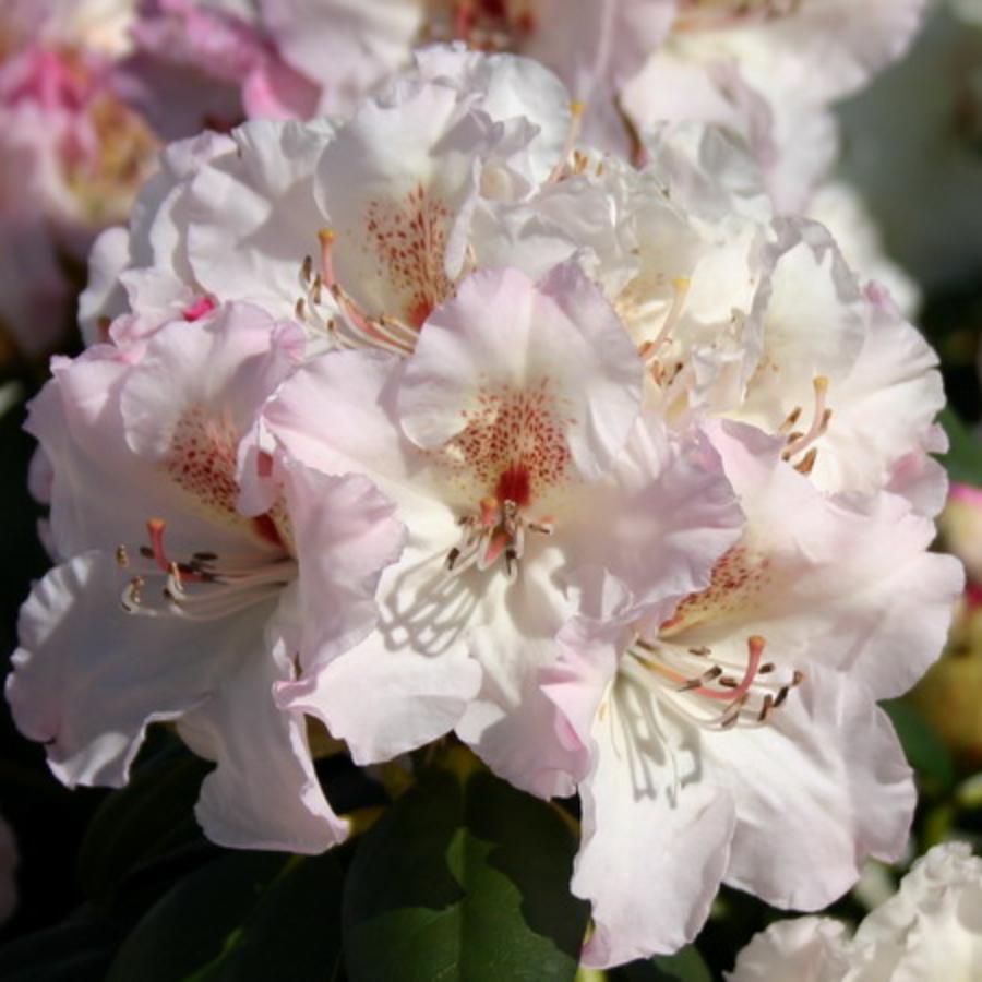 Родендрон гибридный Симона. Куст высотой 120 см. Цветки кремово-розовые с бордовым пятнышком, лепестки с волнистым краем. цветет в начале мая. Зимостойкость до -18°С. Местоположение: полутень, тень. Не так давно рододендрон считался исключительно южным растением. Ситуация изменилась с появлением гибридных морозостойких сортов. Эти высокодекоративные кустарники уже стали популярны среди отечественных цветоводов.<br>