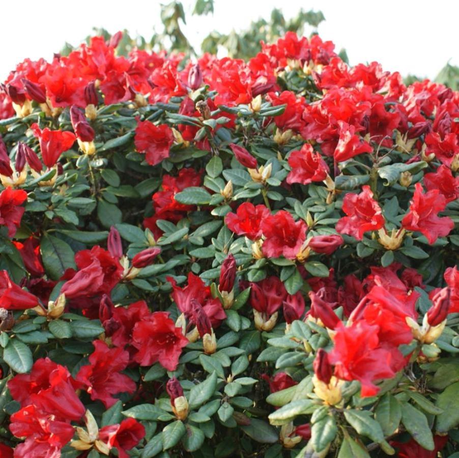 Рододендрон SCARLET WONDER - очень популярный красный рододендрон. Низкорослый вечнозеленый кустарник, подушковидной формы. Ежегодный прирост в высоту и ширину 6-8 см. Долговечность более 30 лет. Крона густая. Листья эллиптические, кожистые, блестящие, длиной до 3-7 см., расположены супротивно, верхняя сторона зеленая, немного шероховатая с белыми редкими волосками, с нижней стороны бархатисто-шероховатые. Осенняя окраска отсутствует. Цветки широко-колокольчатые, ярко-красные с гофрированным краем, душистые, 3-4 см. в диаметре, собраны зонтиком по 8-10 шт. Цветет в мае-июне, часто повторно в августе-сентябре.