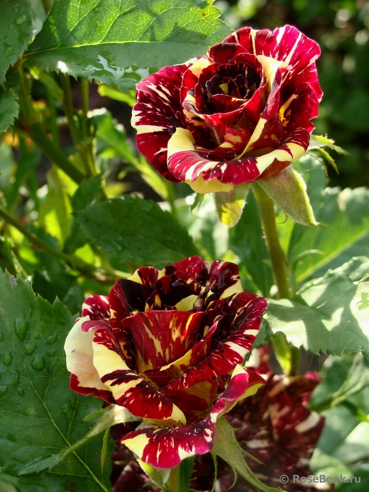 Миниатюрный куст вырастает до 0,5 м в высоту и около 0,4 м в ширину. Крепкие стебли покрыты крупными, ярко-зелеными листьями. На цветоносе обычно формируется один бутон. Размер цветка – 7 см. Основной оттенок – темно-вишневый, дополнительные полоски – желтые и кремовые. Аромат – нежный, легкий. Крупномер Hocus Pocus проявляет среднюю устойчивость к мучнистой росе, но боится черной пятнистости. Внешний вид бутонов может безнадежно испортиться от дождя. Сорт повторноцветущий.