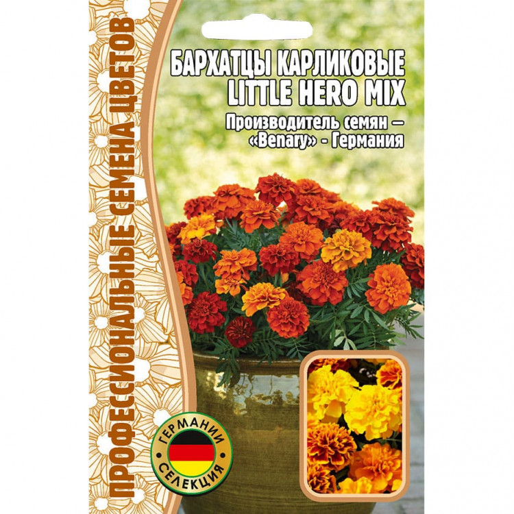 Бархатцы Карликовые Litle hero - супер-компактные (высота 15 см), обильно цветущие бархатцы с яркими соцветиями станут великолепным украшением в вашем салу. Данный сорт характеризуется более выровненными кустиками и более ранним цветением, по сравнению со стандартными сортами. Стебли сильно ветвистые от основания, боковые побеги отклоненные, несут темно-зеленые перисто-рассеченные листочки. В период массового цветения весь кустик покрывается переливающимися яркими соцветиями, превращаясь в один большой шар. Цветут обильно и продолжительно, с июня до заморозков. Сохраняют свою декоративность в течение всего лета. Эти бархатцы великолепно заполняют промежутки между соседними растениями, а также украшают террасы, балконы и вазоны, хороши для создания бордюров. Красиво смотрятся в сочетании с примулами и цинерариями, другими низкорослыми растениями.