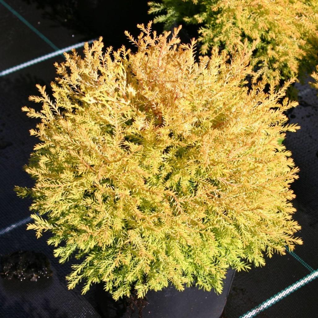 Туя западная "Рейнголд" (Thuja occidentalis Rheingold) - медленнорастущий густой кустарник, достигающий около 130 см высоты. В молодом возрасте форма кроны шаровидная, позже — яйцевидная. Хвоя интенсивно-желтой окраски, зимой коричневая. Ветви тонкие, диморфные, частично игольчатые, частично чешуевидные.